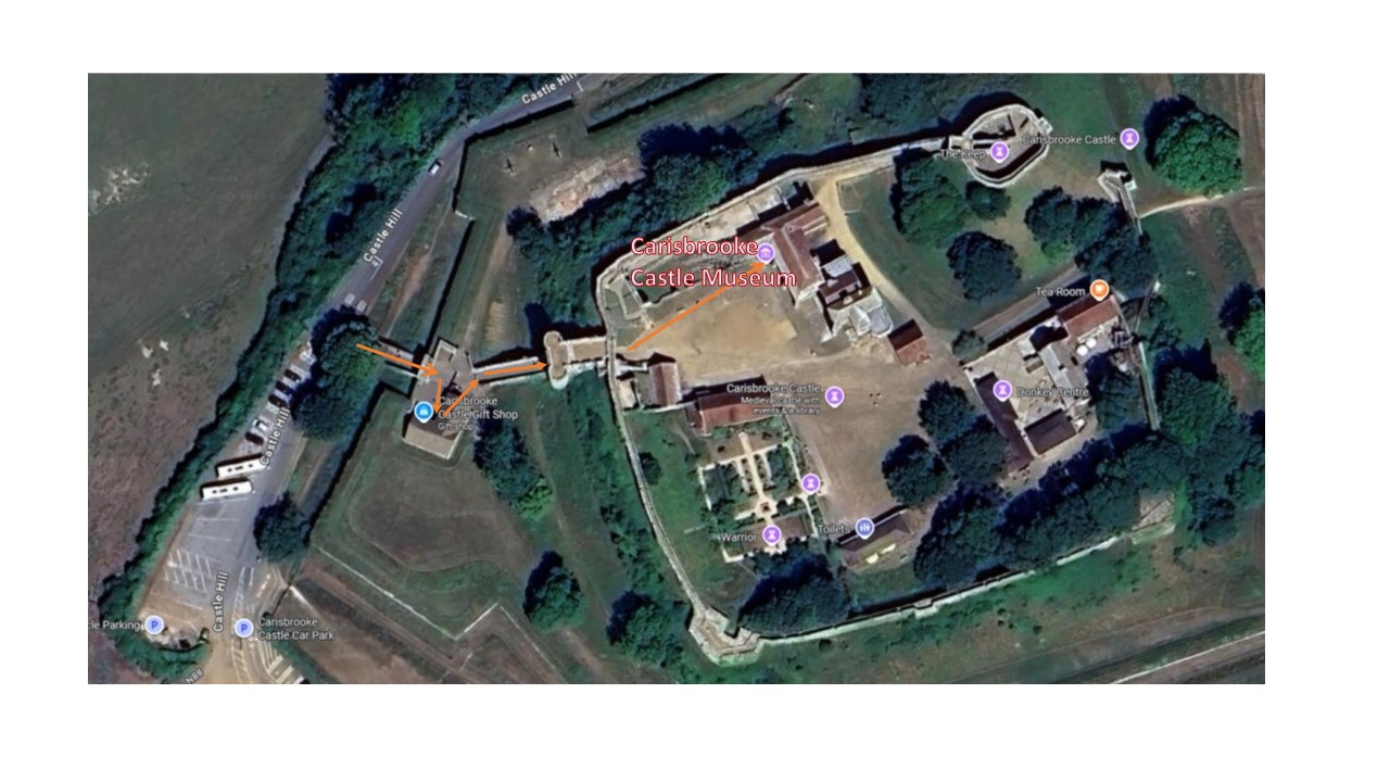 The Museum is approximately 10 minutes’ walk from Carisbrooke High Street, either via Castle Street and Castle Lane or Spring Lane or Cedar Hill and then Castle Hill. The route is steep in places and most of the route does not have a footpath.